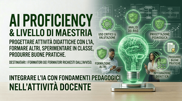 Il livello più avanzato, rivolto ad animatori digitali, figure di sistema e referenti per l'innovazione. Obiettivo: progettare percorsi formativi per i colleghi, documentare le buone pratiche e contribuire alla knowledge base dell'istituto. Corsi disponibili: "Formare i Formatori sull'IA" (30 ore) e "Ricerca-Azione sull'IA a Scuola" (24 ore). Questi percorsi soddisfano l'obbligo previsto dall'avviso di includere almeno un percorso dedicato alla formazione dei formatori interni.